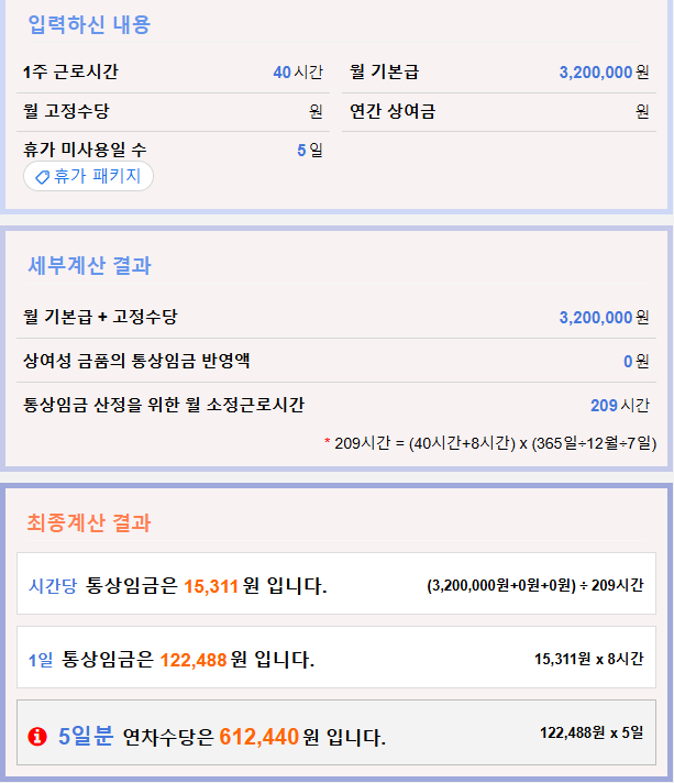 예시) 연차휴가 미사용 일 수 5일 / 기본급이 월 320만원일 경우